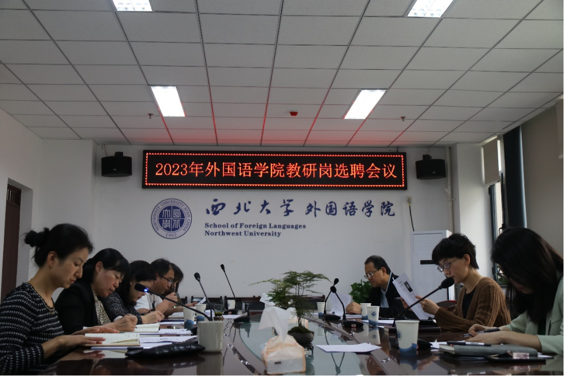 On April 20, 2023, at 2:00 p.m., the 2023 Teaching and Research Post Hiring Meeting of School of Foreign Languages was held in the school’s conference room. The meeting was chaired by Yang Ying, Deputy Dean of Administration, and attended by Wang Jun, Secretary of the Party Committee, Dean Cao Ruonan, Li Mi, Deputy Dean of Teaching, Su Rui, Deputy Dean of Research, Li Tie, Director of the English Department, and Xu Na, Dean’s Assistant.