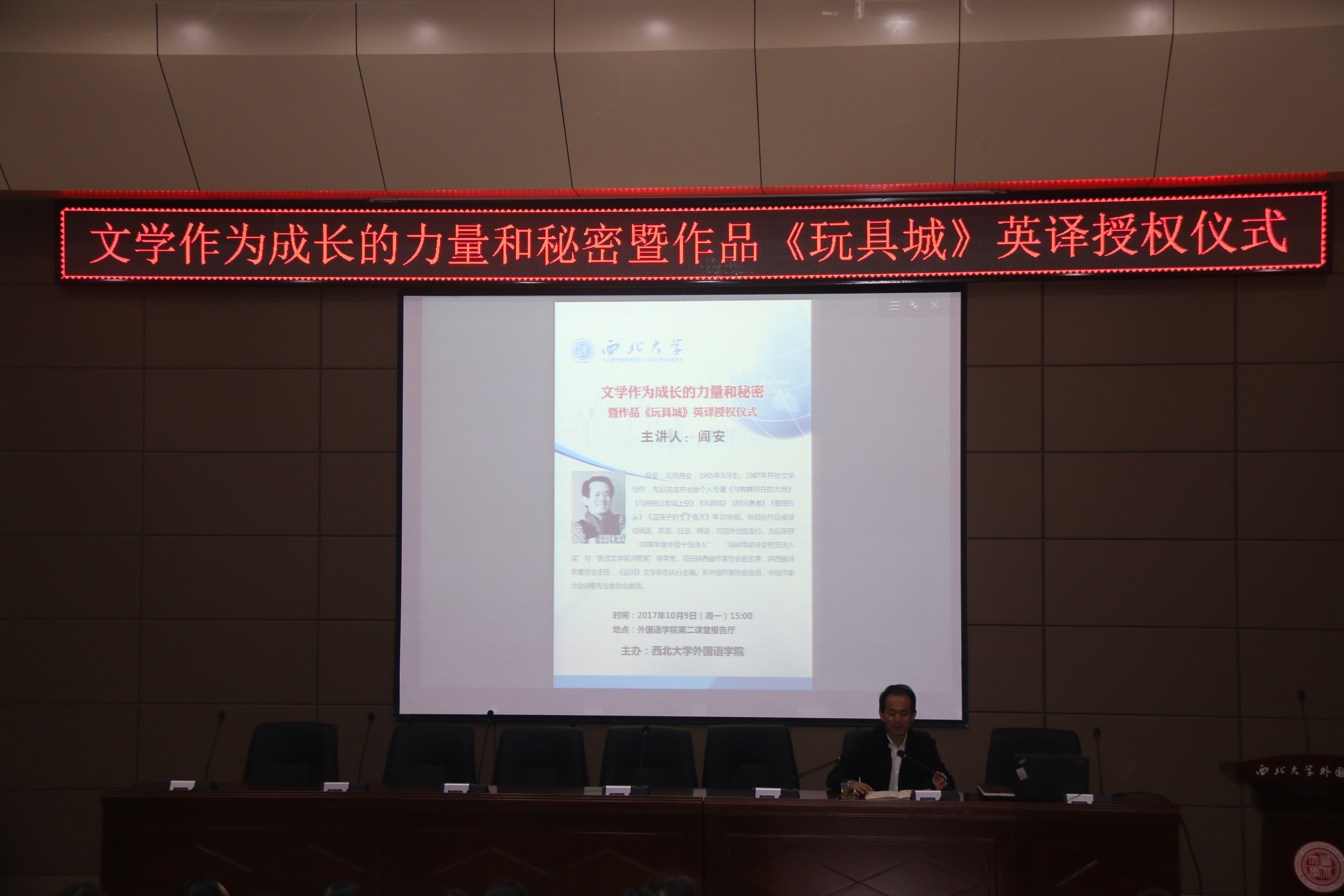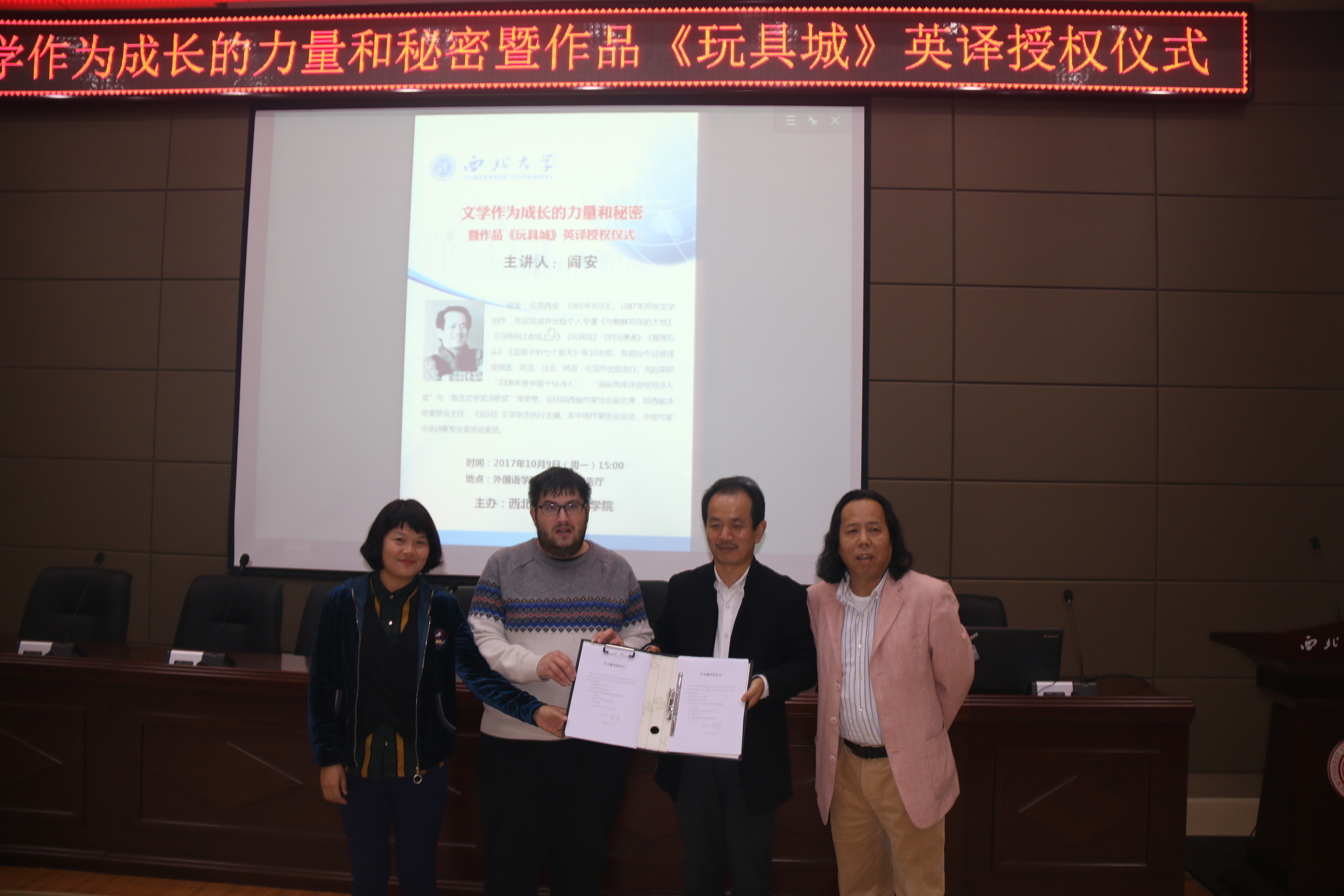 2017年10月9日下午,陕西省作家协会副主席、陕西省诗歌委员会主任阎安先生的诗集作品《玩具城》英译授权仪式在我院第二课堂报告厅举行。我院院长胡宗锋教授宣读了授权书,诗集将由我院胡宗锋教授、英籍外教Robin博士、西安财经学院李莹老师翻译完成。