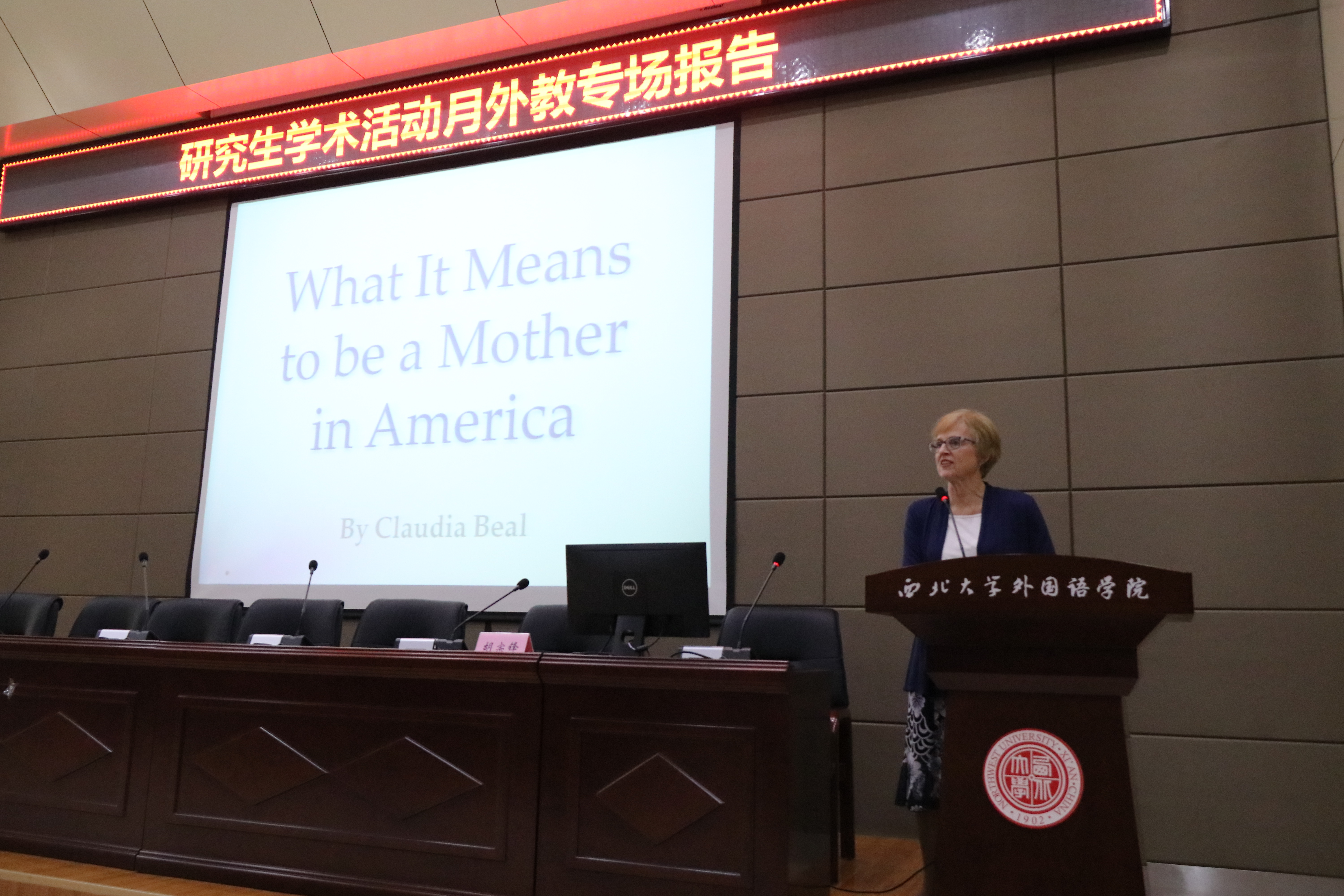 Claudia Beal(克劳蒂亚·比尔)以“在美国,作为一名母亲的意义”为主题,从介绍自己的大家庭入手,向大家展示了传统美国家庭的构成,以及母亲在家庭中的影响和作用。她以自己丰富的育儿经验向与会师生深入浅出地分析了,对处在幼儿时期孩子的教育是如何影响他的一生。同时,她也结合实际分析了在当代美国妈妈们所面临的问题,这对中国亲子教育具有很好的借鉴意义。