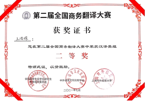 2021年7月18-19日,由全国翻译专业学位研究生教育指导委员会、中外语言文化对比研究会和上海对外经贸大学共同举办的“第二届全国商务翻译大赛”决赛和颁奖仪式在上海对外经贸大学举行。我院英语专业2018级学生王浩琛同学喜获汉译英组二等奖,于亚莉老师获优秀指导教师奖,我校获优秀组织奖。